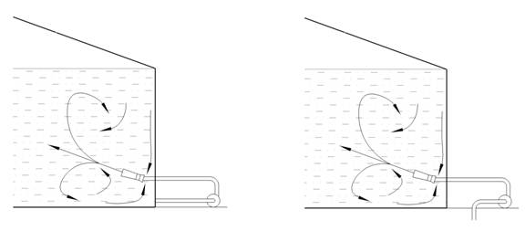 如果一個(gè)或幾個(gè)SG系列罐用噴射式混合器位置排列正確的話,在罐中就產(chǎn)生了一個(gè)三維射流,它把整個(gè)罐內(nèi)的物質(zhì)進(jìn)行均勻混合,而不產(chǎn)生旋轉(zhuǎn)的運(yùn)動(dòng)。