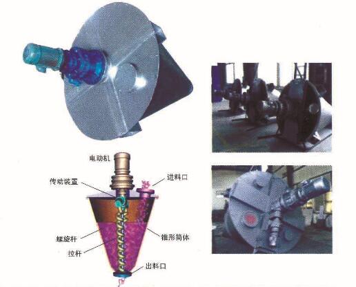 YSH型雙螺旋錐形混合機,它由噴液裝置、傳動部分、筒蓋、螺旋、簡體、出料閥箱等組成。